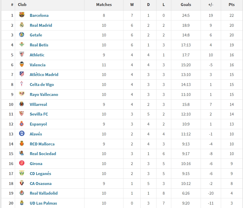 皇马6胜2平2负积20分第二。马竞仅取得4胜3平3负积15分,位居第7。
