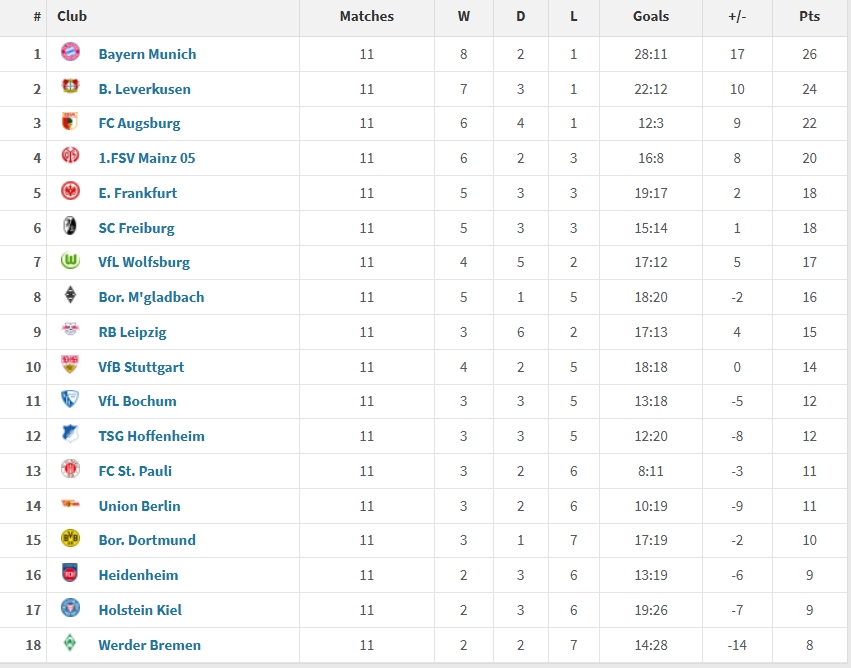 03月18日讯 2025年至今,德甲共进行了11场比赛,其中拜仁拿到26分最高,其次是24分的勒沃库森,而莱比锡、多特分别仅拿到了15分和10分。