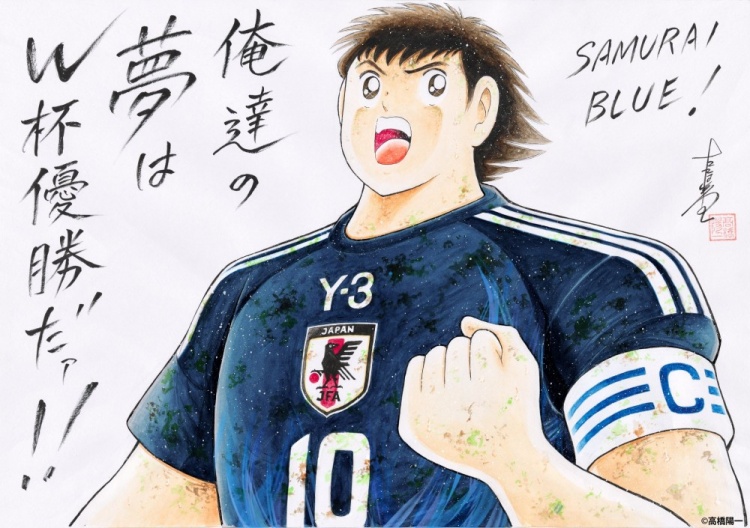 日本队官推晒出了一张由《足球小将》作者高桥阳一手绘的大空翼海报,文字内容为:“蓝武士!我们的梦想是世界杯冠军!”