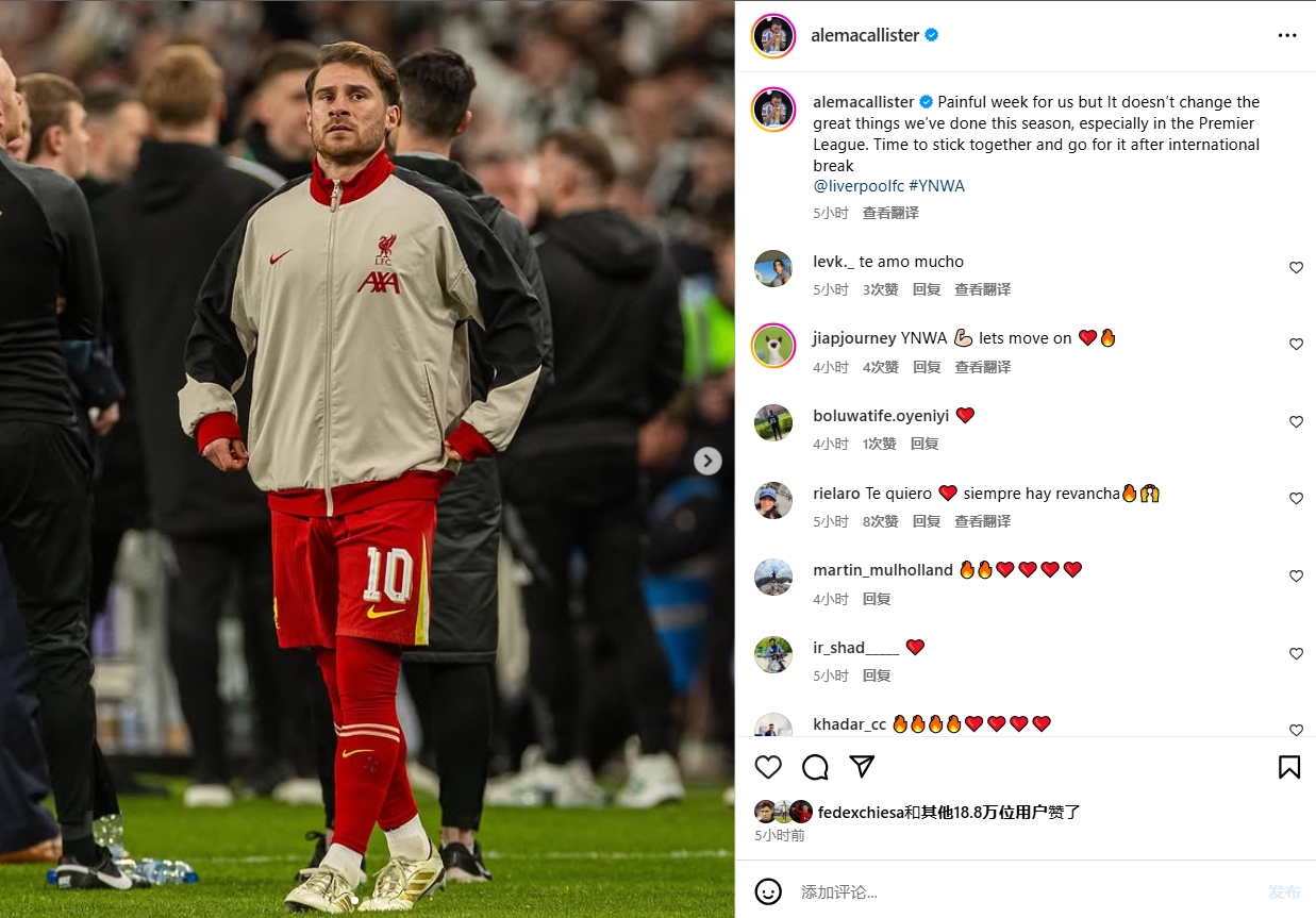 麦卡利斯特在社交媒体上写道:“对我们来说,这是痛苦的一周,但这不会改变我们本赛季的出色表现,特别是在英超联赛中。是时候团结一致,在国际比赛日之后全力以赴了。”