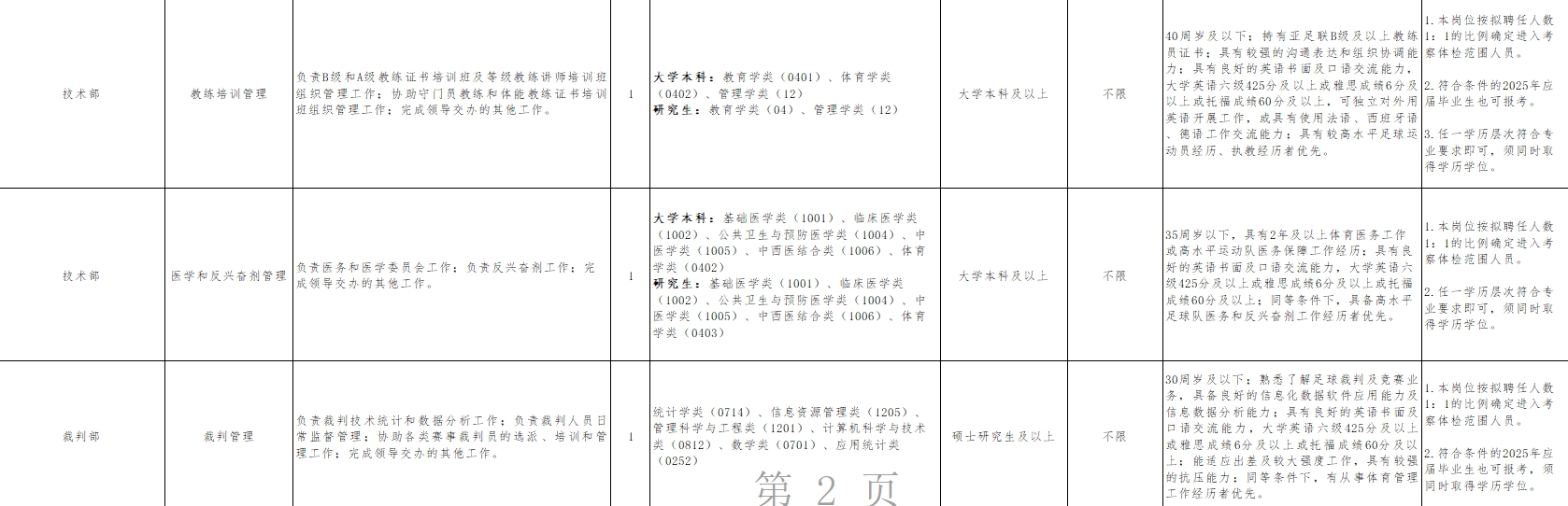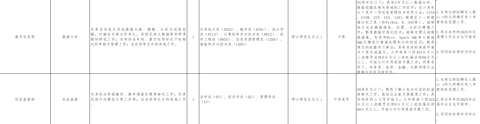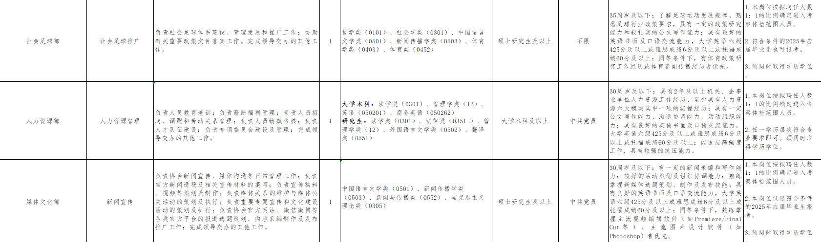 另外,综合部(财务审核)、国家队管理部(队伍管理)、裁判部(裁判管理)、社会足球部(社会足球推广)、媒体文化部(新闻宣传)、数字信息部(数据分析)、纪检监督部(纪检监督)要求学历为硕士研究生及以上,其余岗位为大学本科及以上。