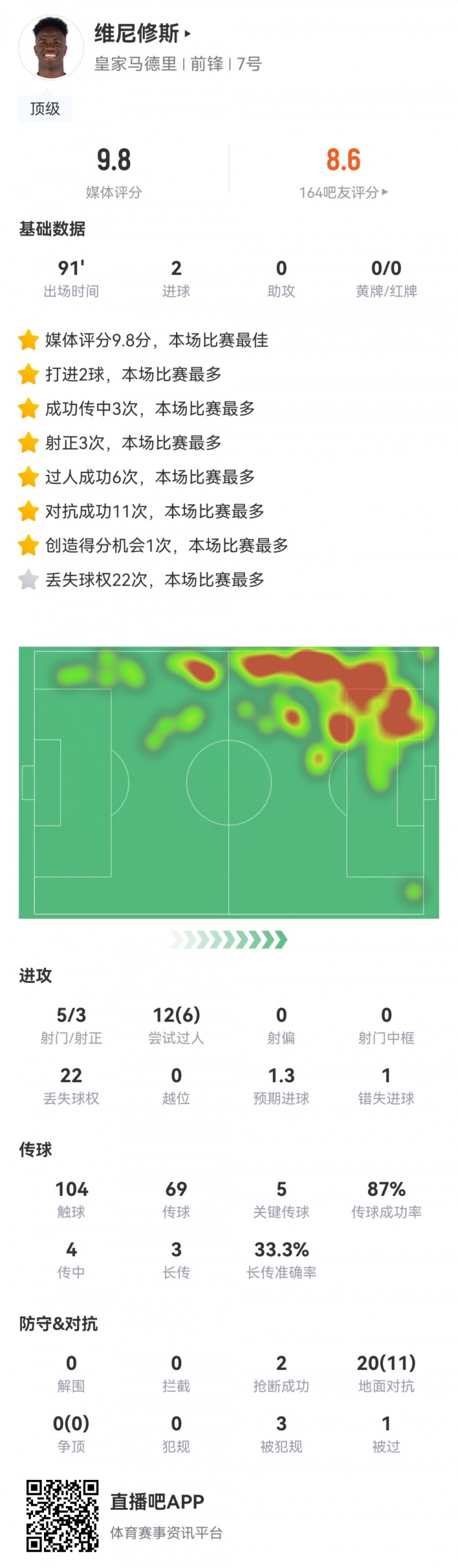 2025-10-05 08:03:03差一点满分!维尼修斯数据:2粒进球104次触球5次关键传球评分9.8