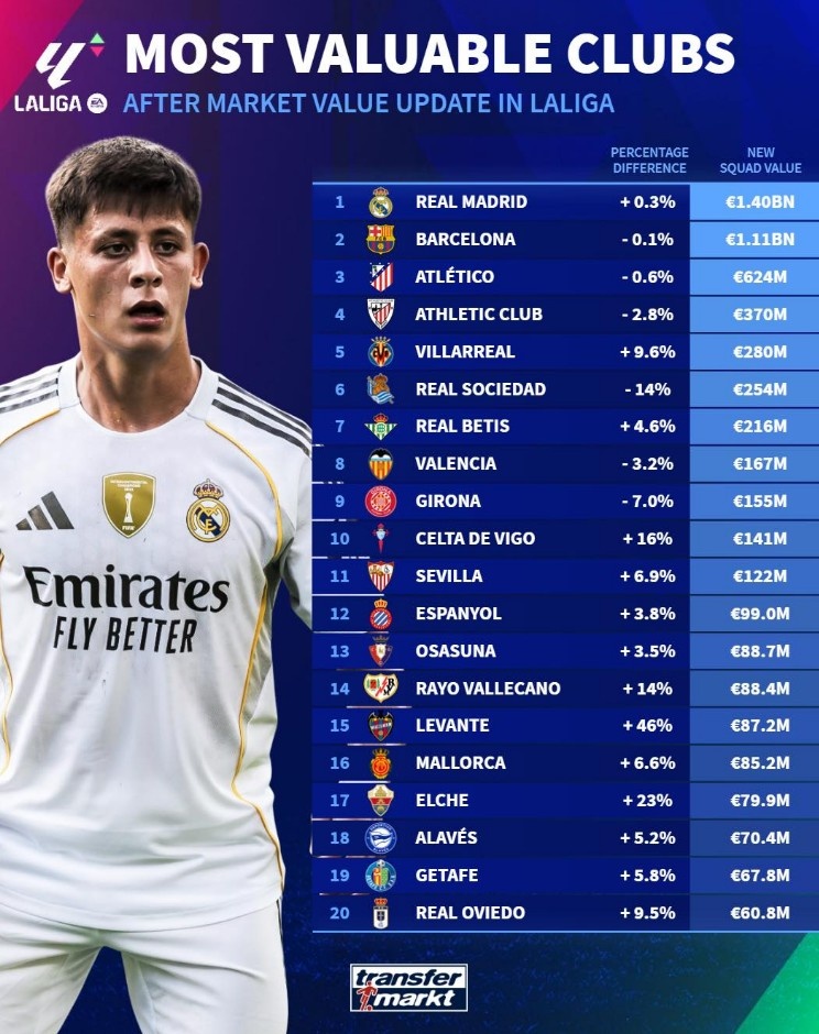 2025-10-06 00:06:43西甲球队身价榜:皇马14亿欧居首,巴萨11.1亿欧次席,马竞第三