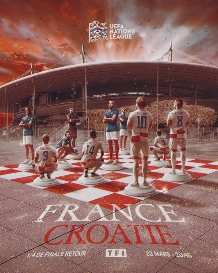 法国队官方社媒发布了为次回合制作的海报,内容为两队球员在球场外的棋盘上对峙,姆巴佩、莫德里奇领衔出镜。