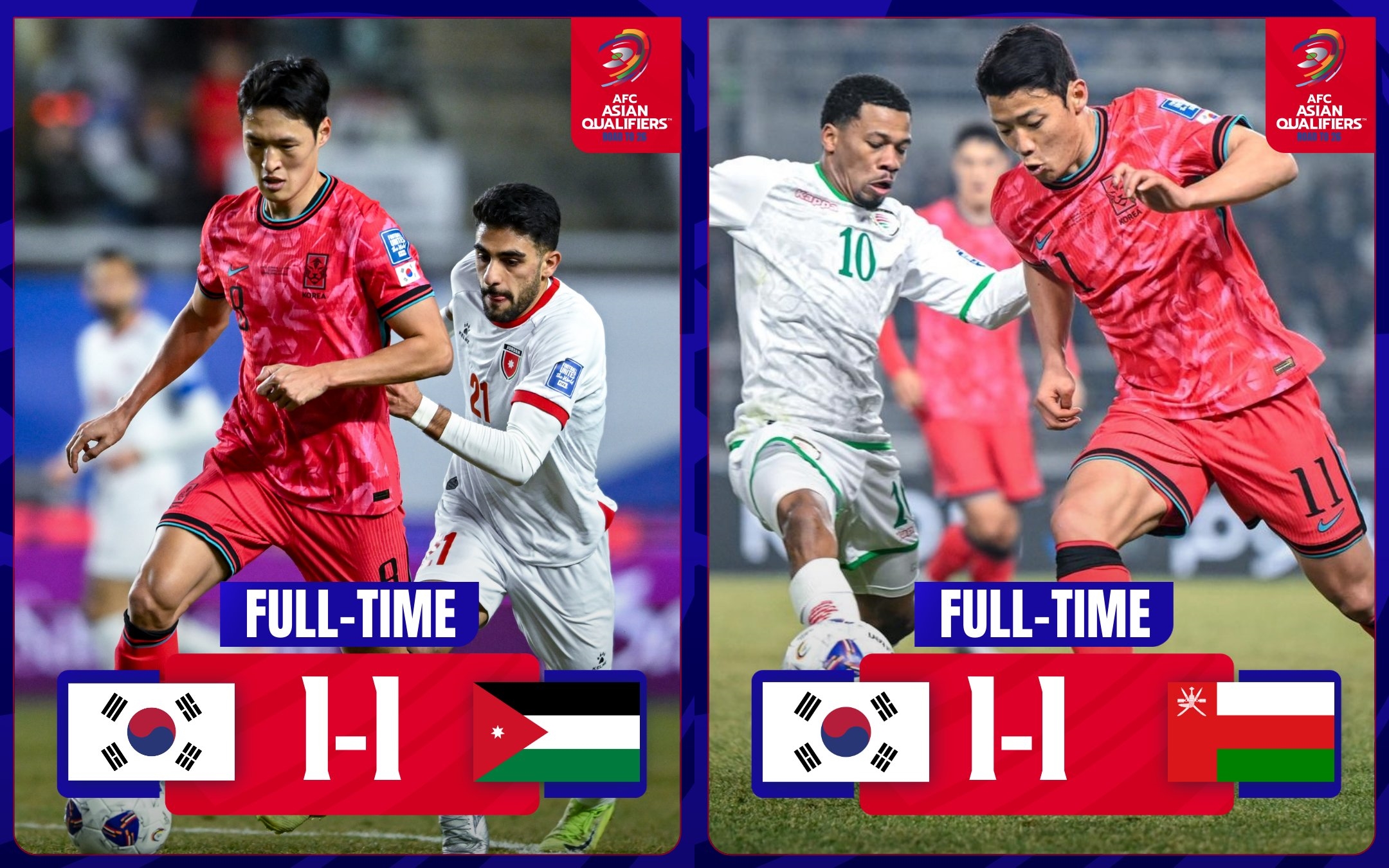 03月25日讯 世预赛亚洲区第三阶段B组,韩国在主场连续遭遇阿曼和约旦1-1逼平,无缘提前晋级世界杯。